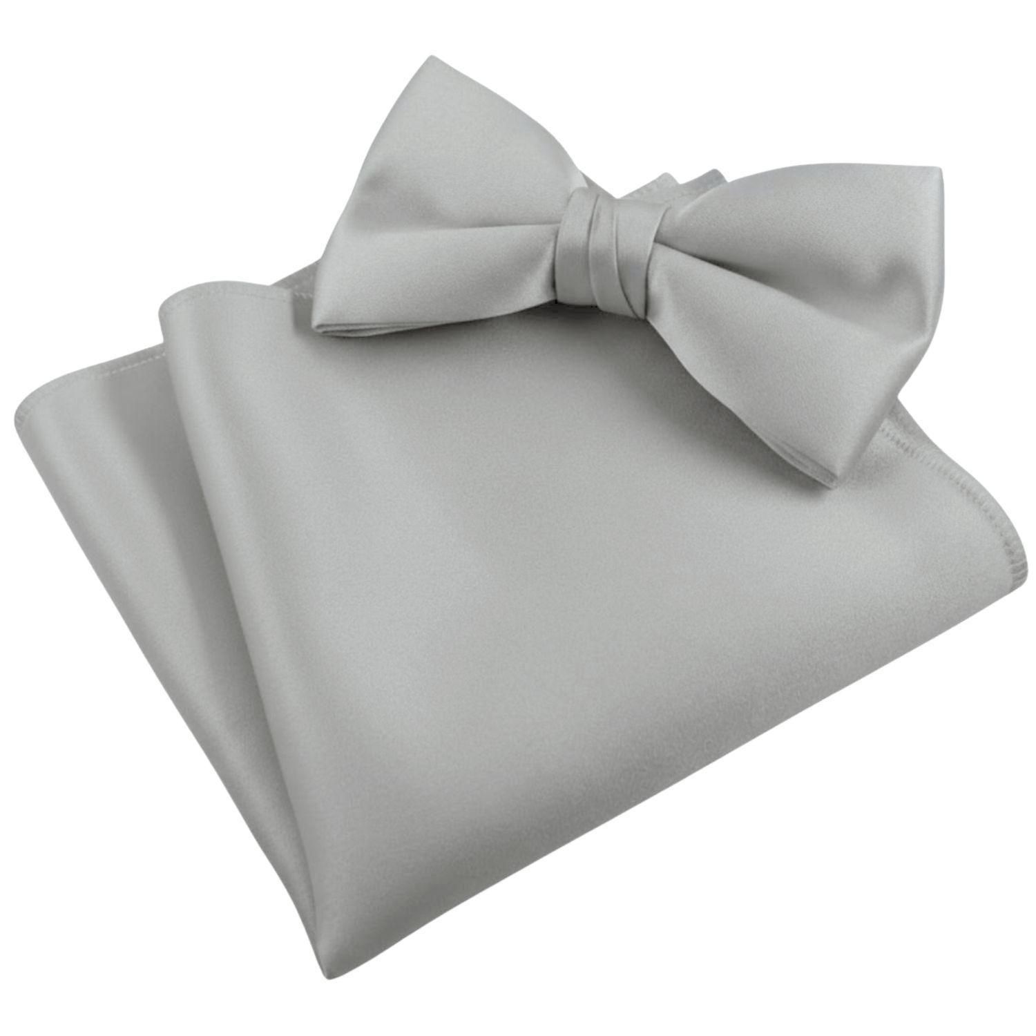 程よい光沢のあるポリエステルサテンの蝶ネクタイとポケットチーフのセット。