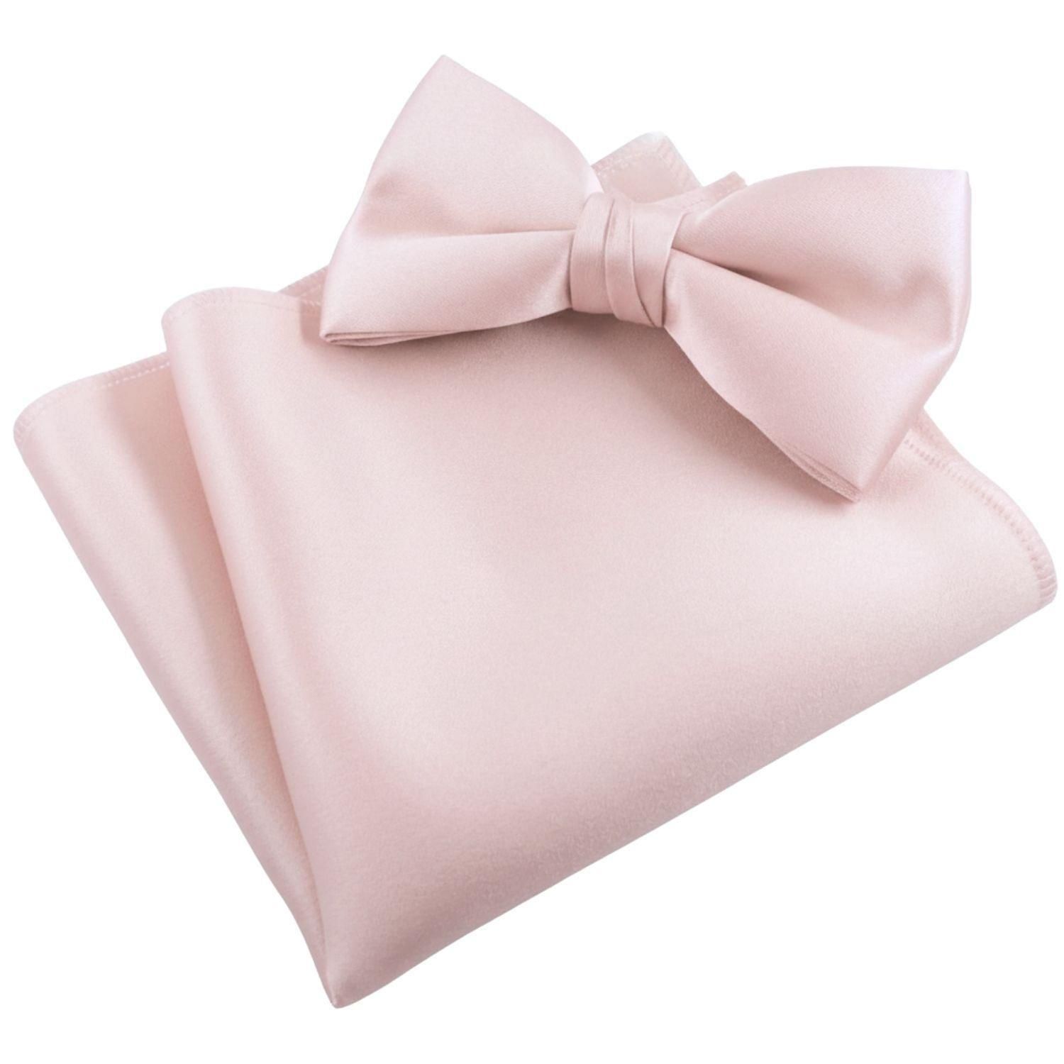 程よい光沢のあるポリエステルサテンの蝶ネクタイとポケットチーフのセット。